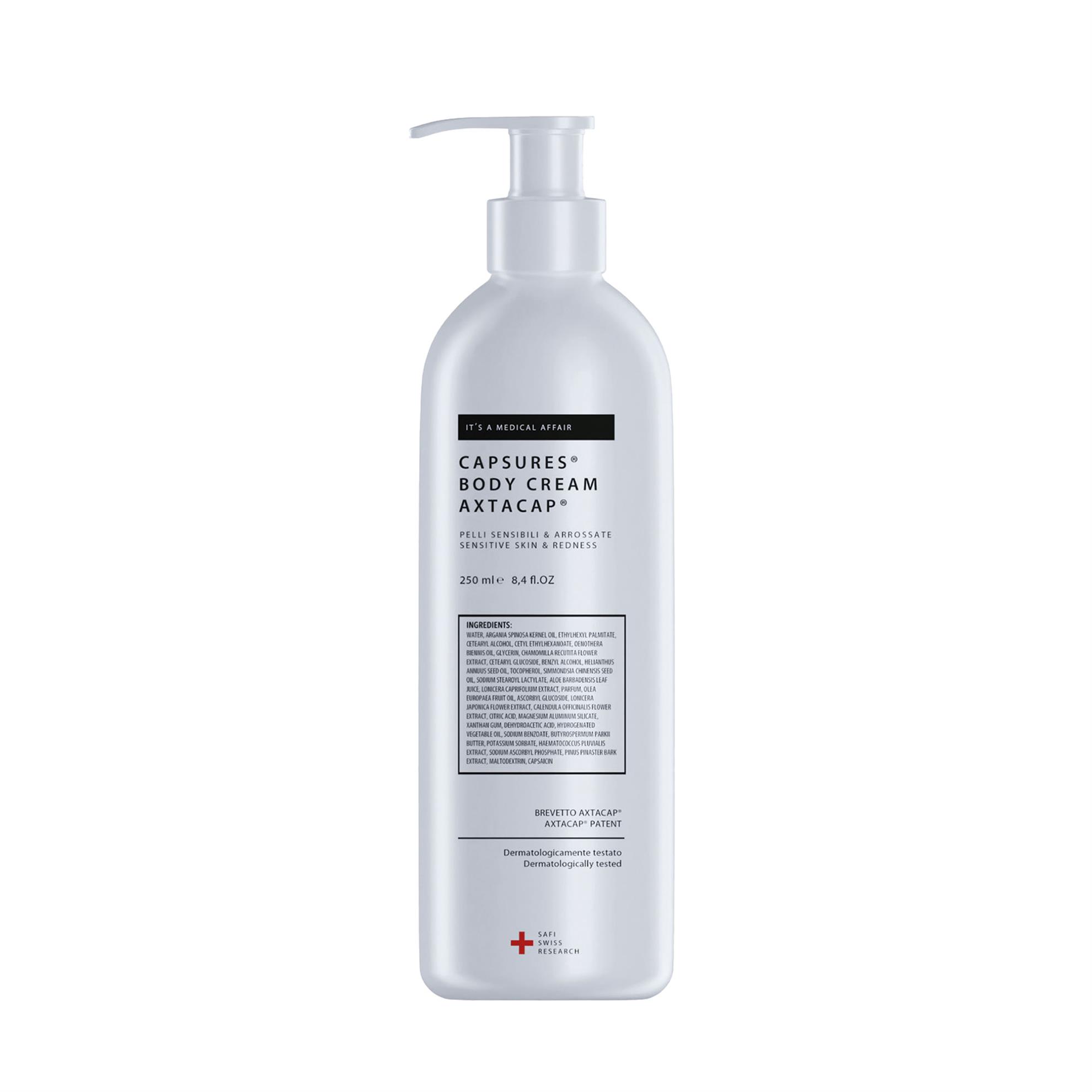 Capsures® Vücut Kremi, astaksantin ve fenilkapsaisin içeren patentli AxtaCap® bileşimi ile geliştirilmiş özel bir cilt bakım ürünüdür. Aloe vera, papatya, calendula ve Pinus pinaster gibi yatıştırıcı bileşenlerle zenginleştirilmiş formülü, oksidasyonu azaltmaya yardımcı olur ve cildin doğal savunma mekanizmasını destekler. Hassas ve kızarık ciltler için idealdir.